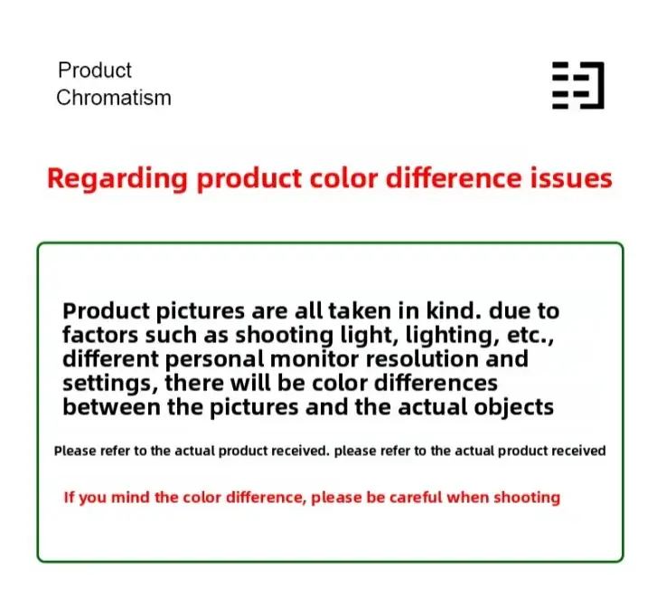 بسبب الاختلافات في إضاءة التصوير الفوتوغرافي وكل شاشة، قد تكون هناك درجات مختلفة من اختلاف اللون.بسبب القياس اليدوي، قد يختلف مقاس المنتج بمقدار 0.5-1 سم.يرجى السماح بوجود أخطاء طفيفة في الحجم.