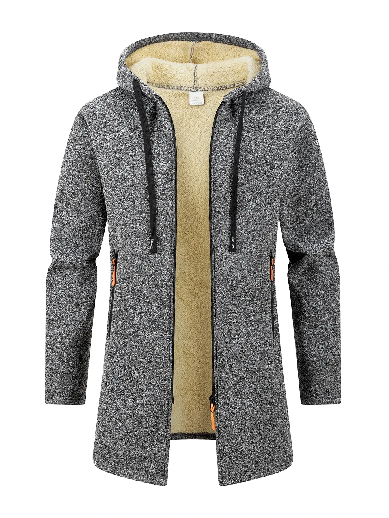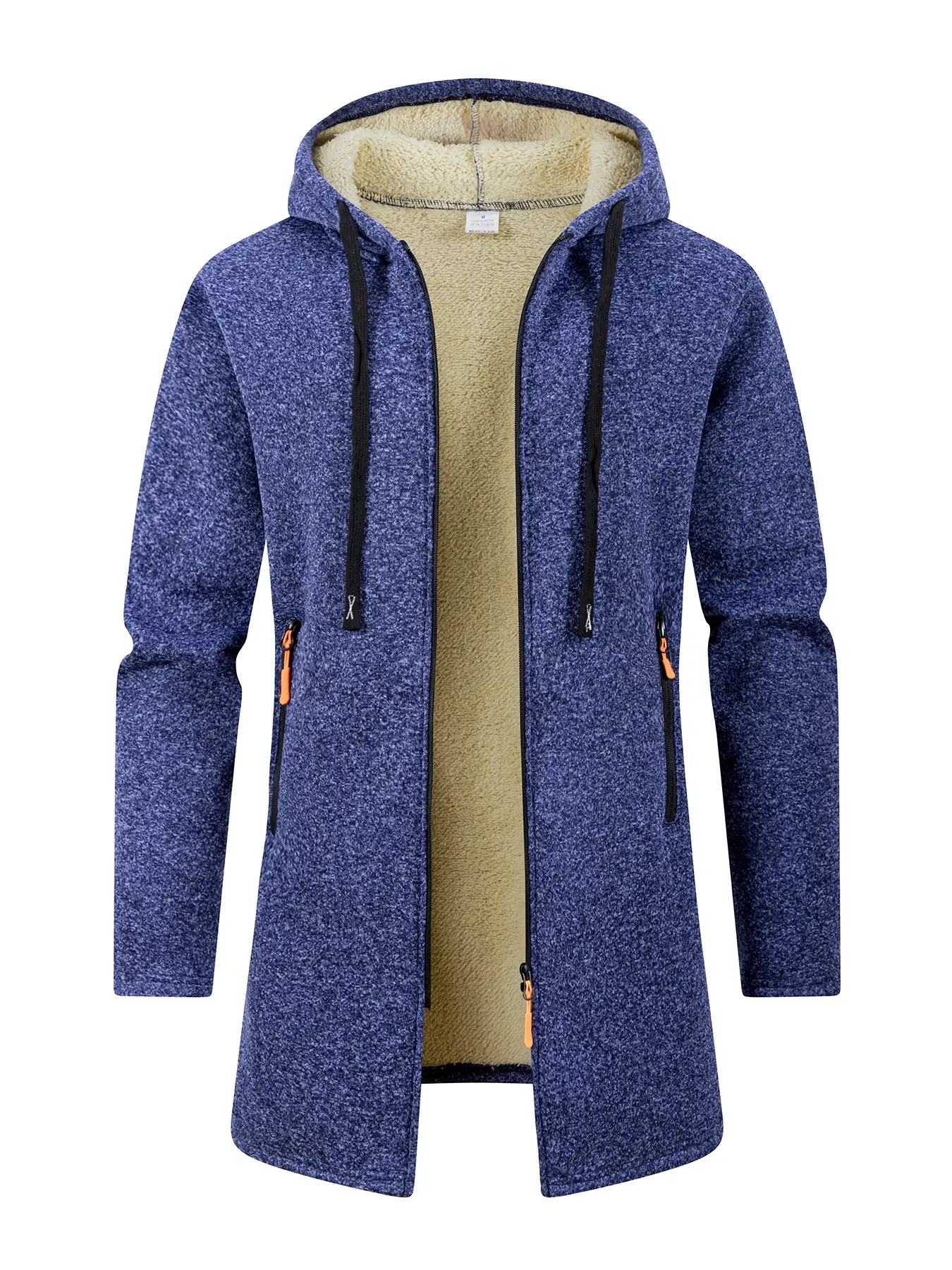 1. خامة عالية الجودة: السترة ذات القلنسوة الطويلة السميكة للرجال مصنوعة من نسيج محبوك مبطن بالصوف عالي الجودة، مما يوفر الدفء والراحة.تصميم السحاب الكامل سهل الارتداء والخلع، ويوفر الغطاء حماية إضافية ضد الطقس البارد.