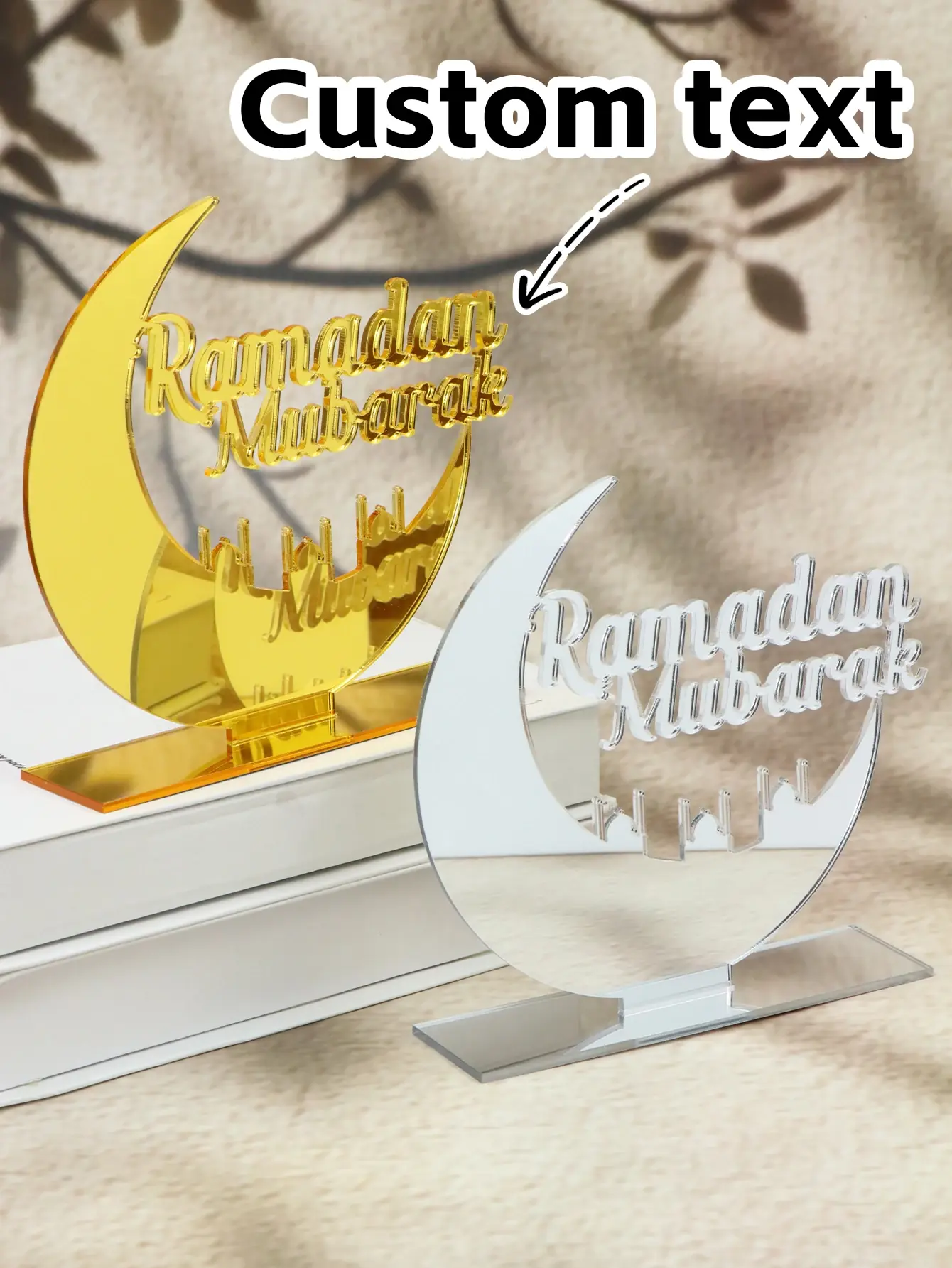 يدعم تخصيص النصوص المتعلقة بالرمضان (مثل *رمضان مبارك*، *عيد مبارك*)، الأسماء، أو التمنيات الشخصية، مما يجعل زينة رمضان الخاصة بك أكثر احتفالية.انقش تمنياتك الشخصية على الزخارف لتتناسب تمامًا مع الأجواء التذكارية والامتنانية التي يحملها شهر رمضان.