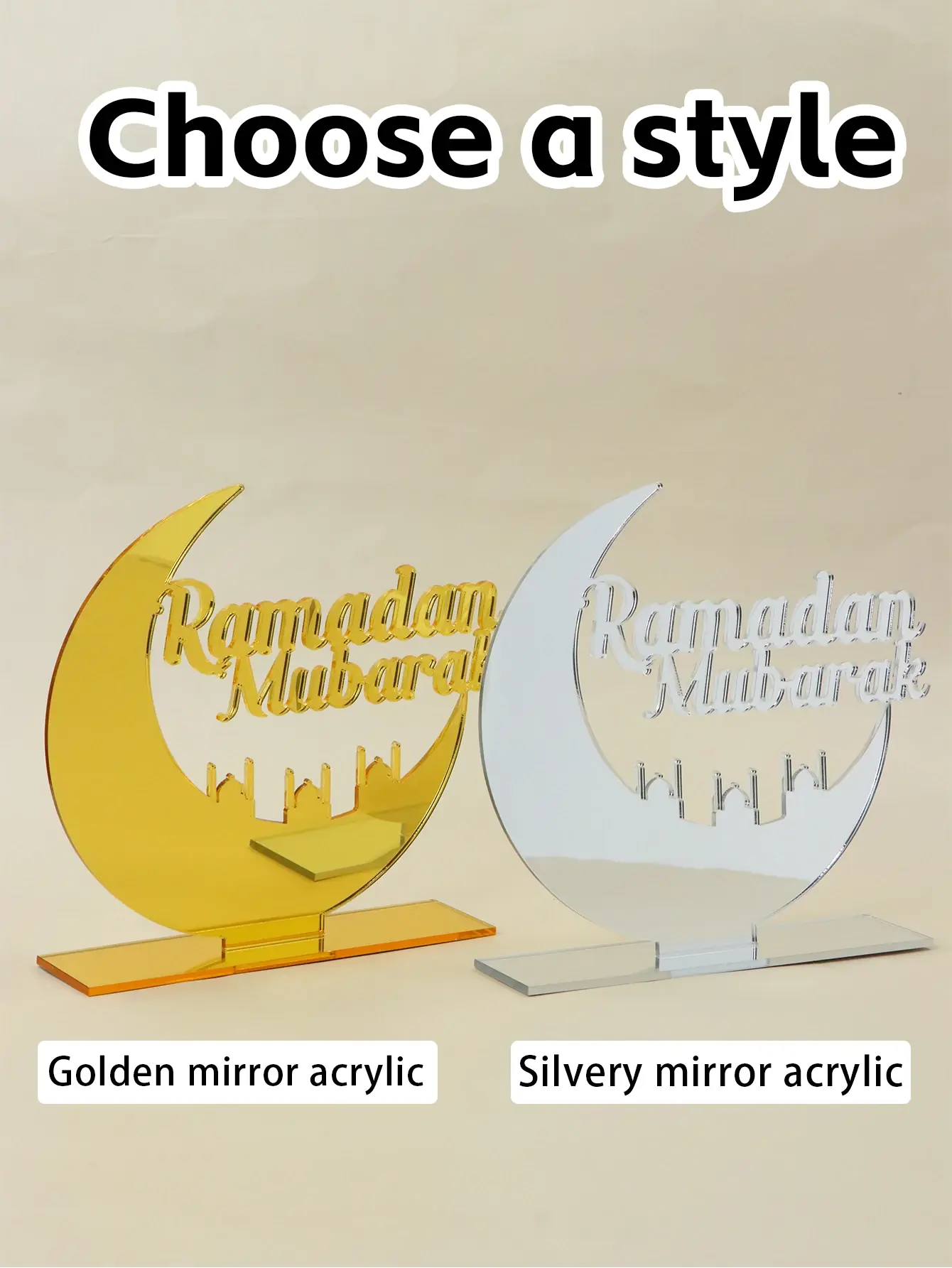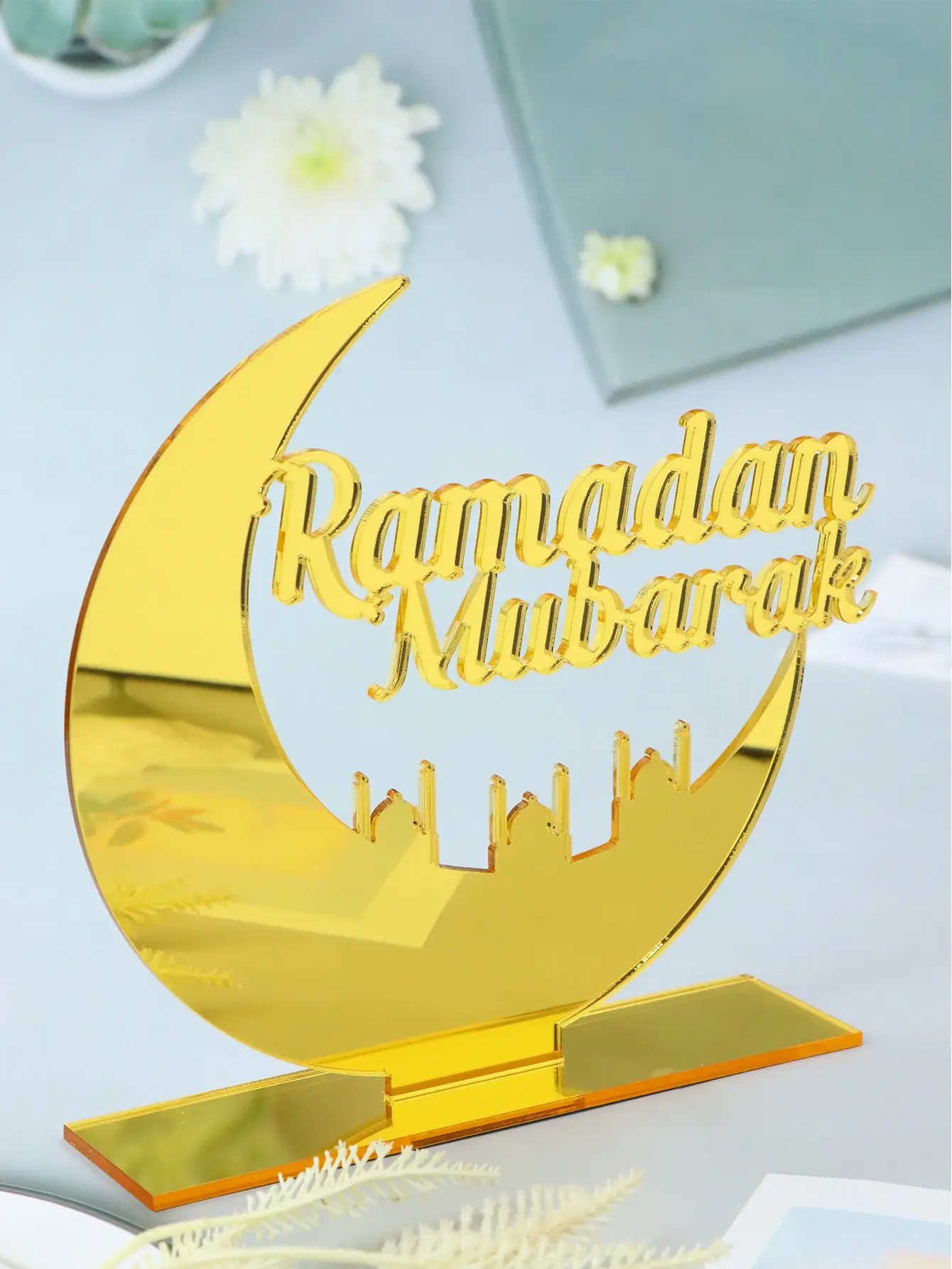 مصنوع من مادة الأكريليك المطلية بالذهب/الفضة، يتميز السطح بلمعان عالٍ وتأثير انعكاسي دقيق، مما يجعله يبدو أكثر أناقة وفخامة تحت الضوء.المادة متينة ومقاومة للتآكل، ولا تتلاشى أو تتشوه بسهولة، مع الحفاظ على ملمسها الشفاف حتى بعد العرض لفترة طويلة.