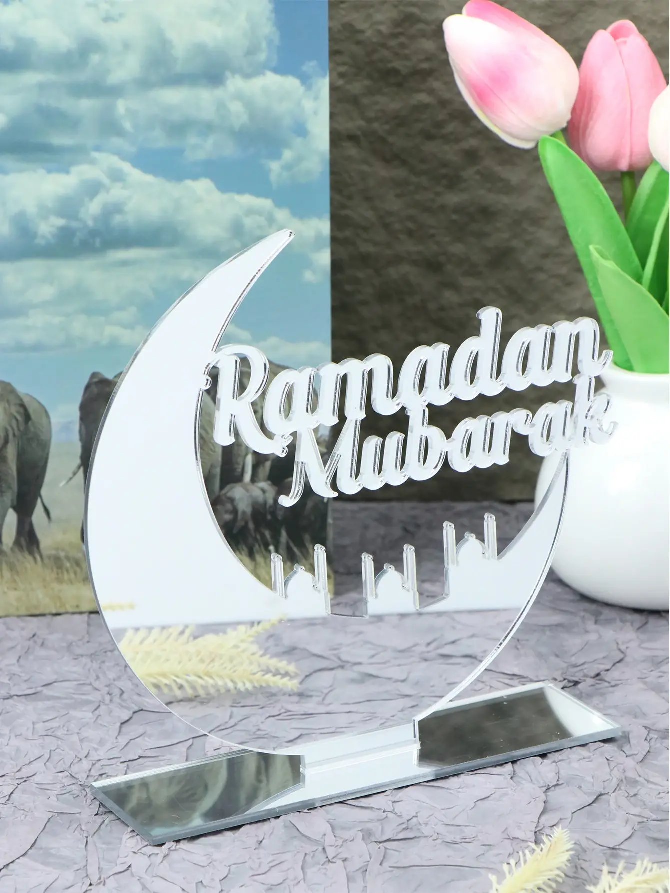 مستوحى من الشكل الأيقوني للقمر في الثقافة الإسلامية، مع تفاصيل مصانع المدينة، يعكس بدقة الدلالات الدينية والثقافية لشهر رمضان.بصريًا، يتميز بشعور احتفالي تقليدي مع جمالية عصرية بسيطة، مما يجعله خيارًا ممتازًا لتزيين رمضان.