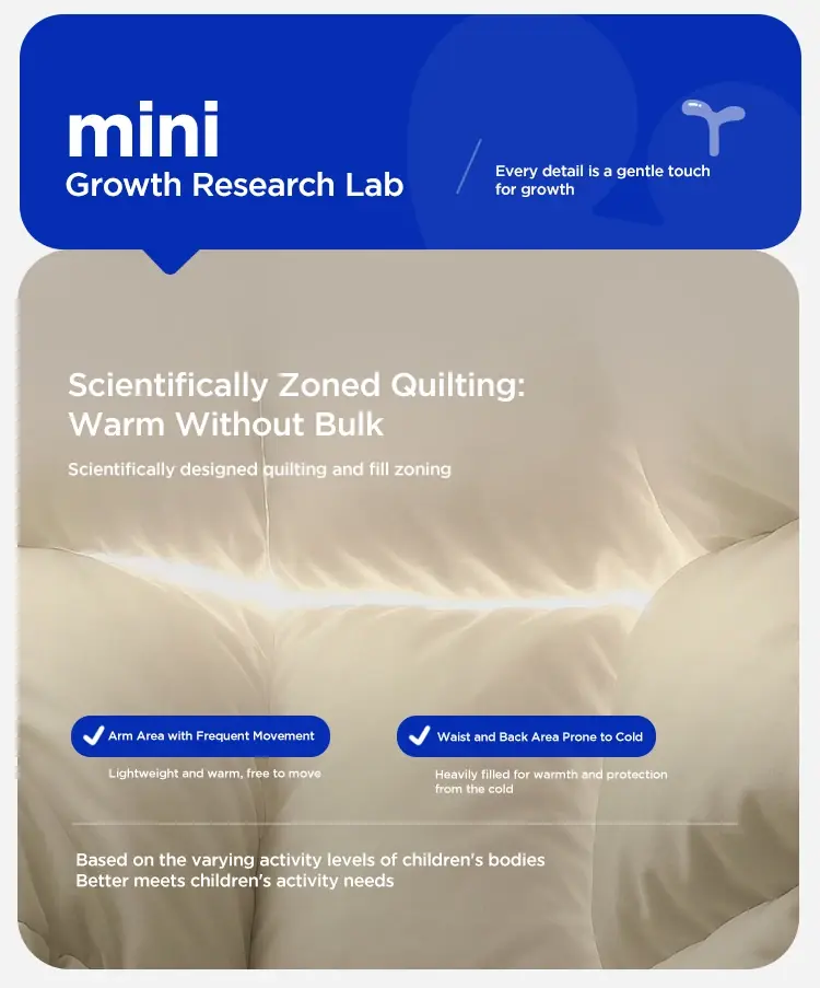 تصميم رقيق ولكنه دافئ يوازن بين العزل والقدرة على الحركة. مثالية للأطفال النشيطين، مما يسمح بتمدد غير مقيد مع الحفاظ على راحتهم في الشتاء.