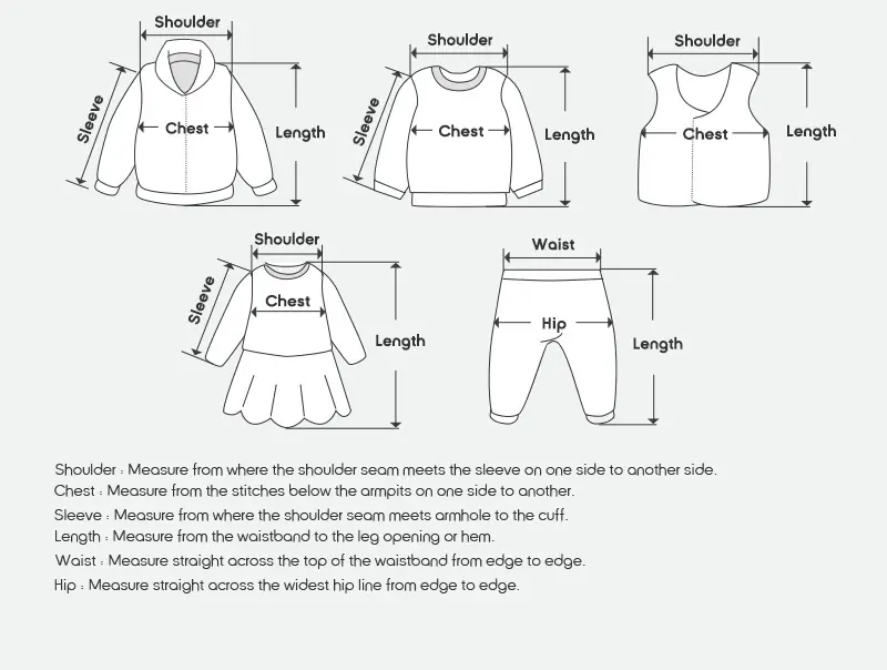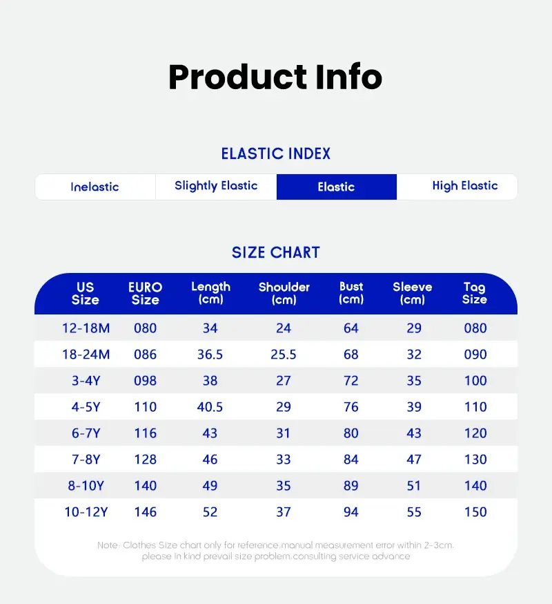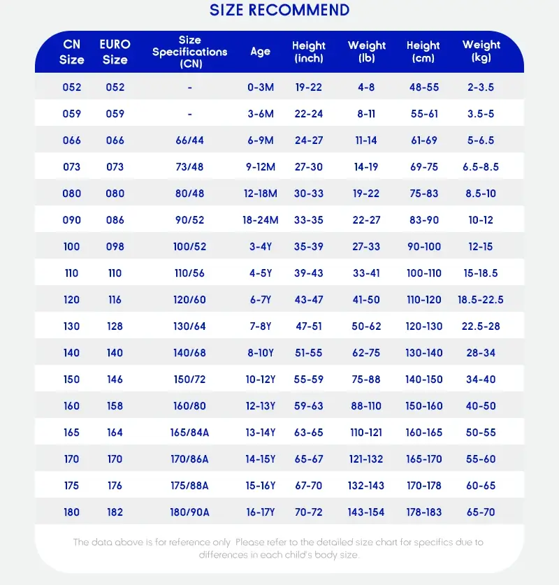 10 (140cm), 12 (150cm), 18M (80cm), 2T (90cm), 3T (100cm), 4T (110cm), 5-6 (120cm)