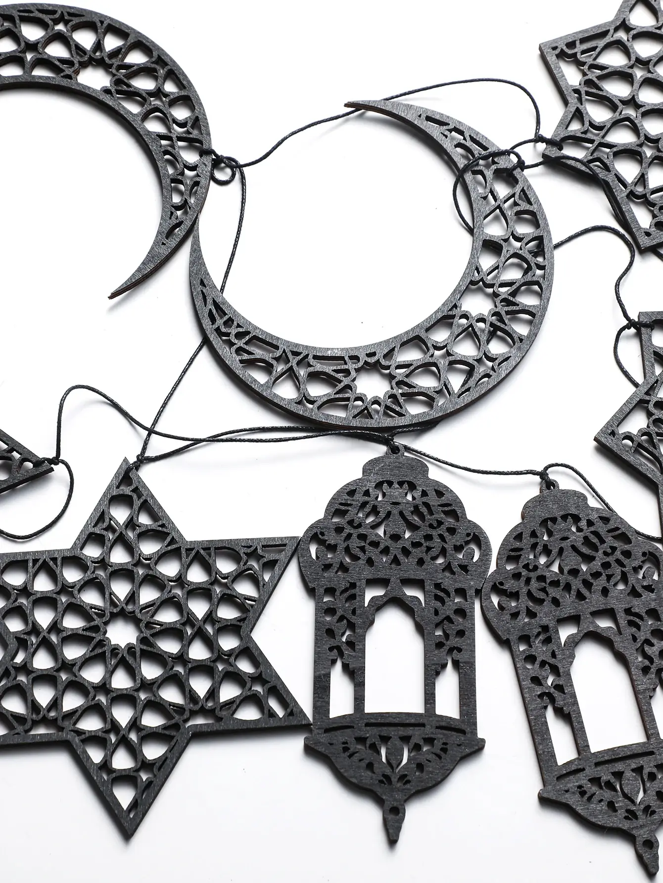 يتميز علم سحب رمضان بتصميم أنيق مع نجمة خشبية سوداء وفانوس قمر، مما يضيف لمسة من الرقي إلى ديكور منزلك.