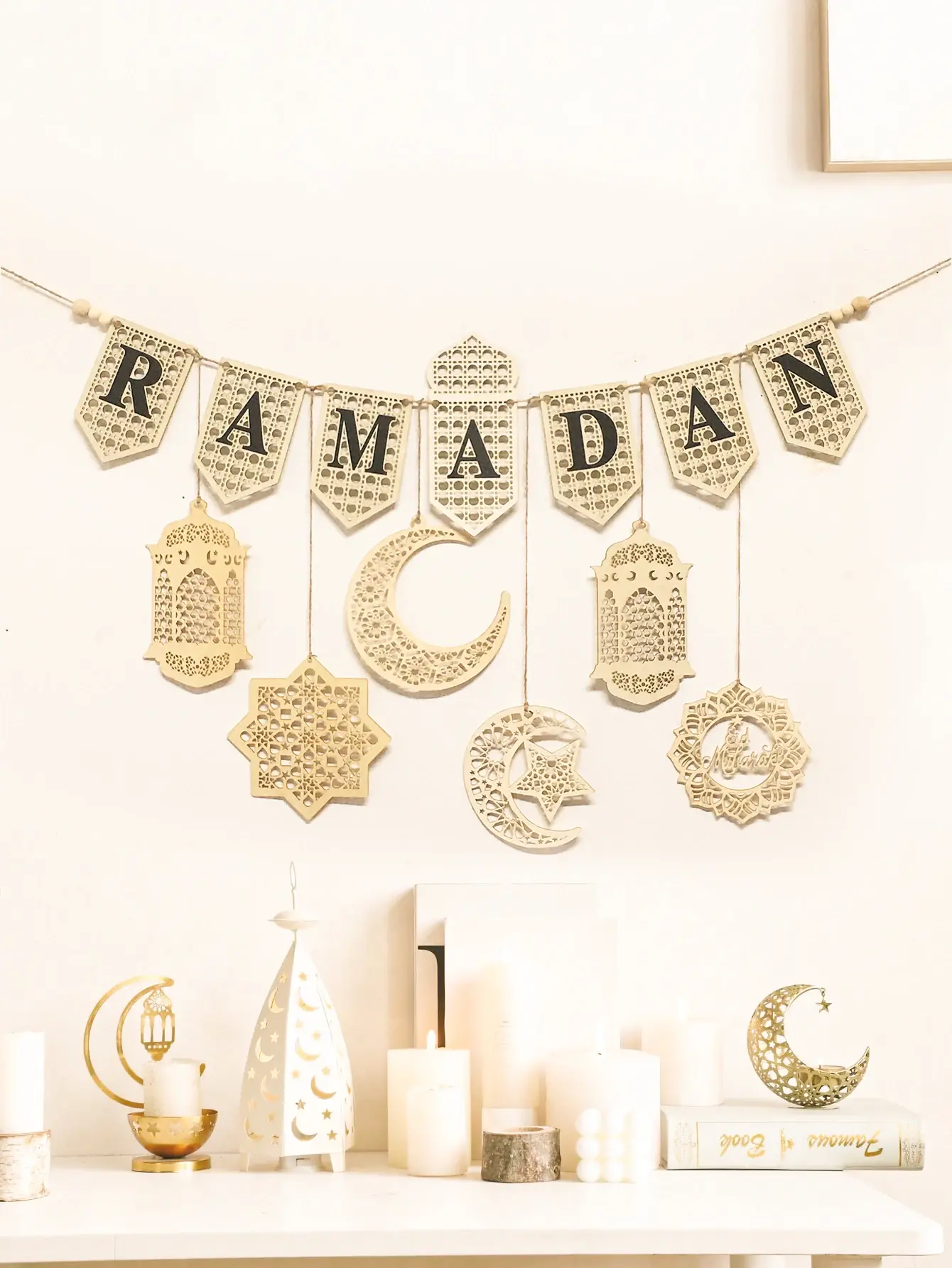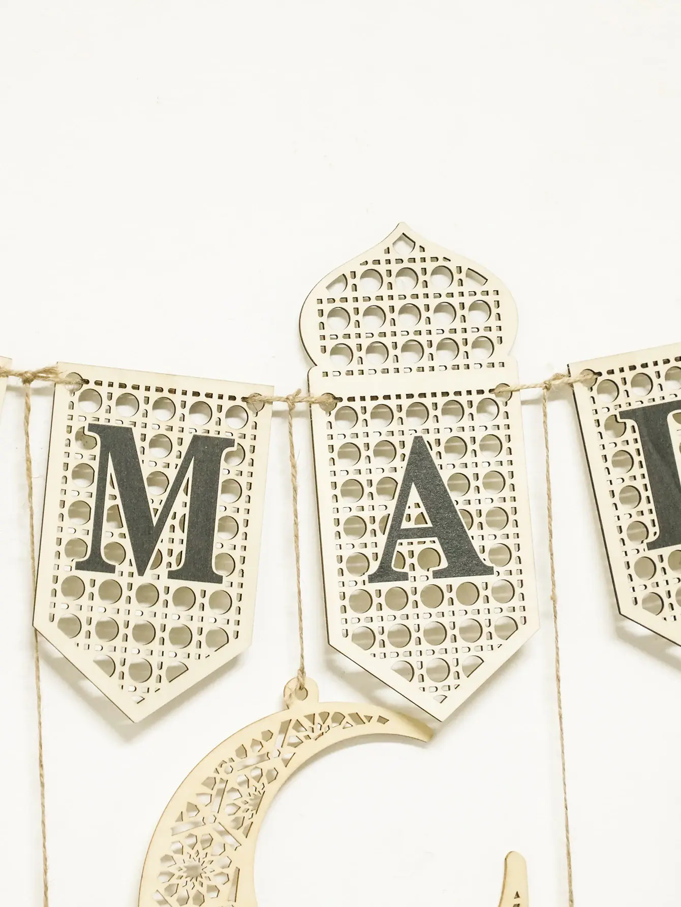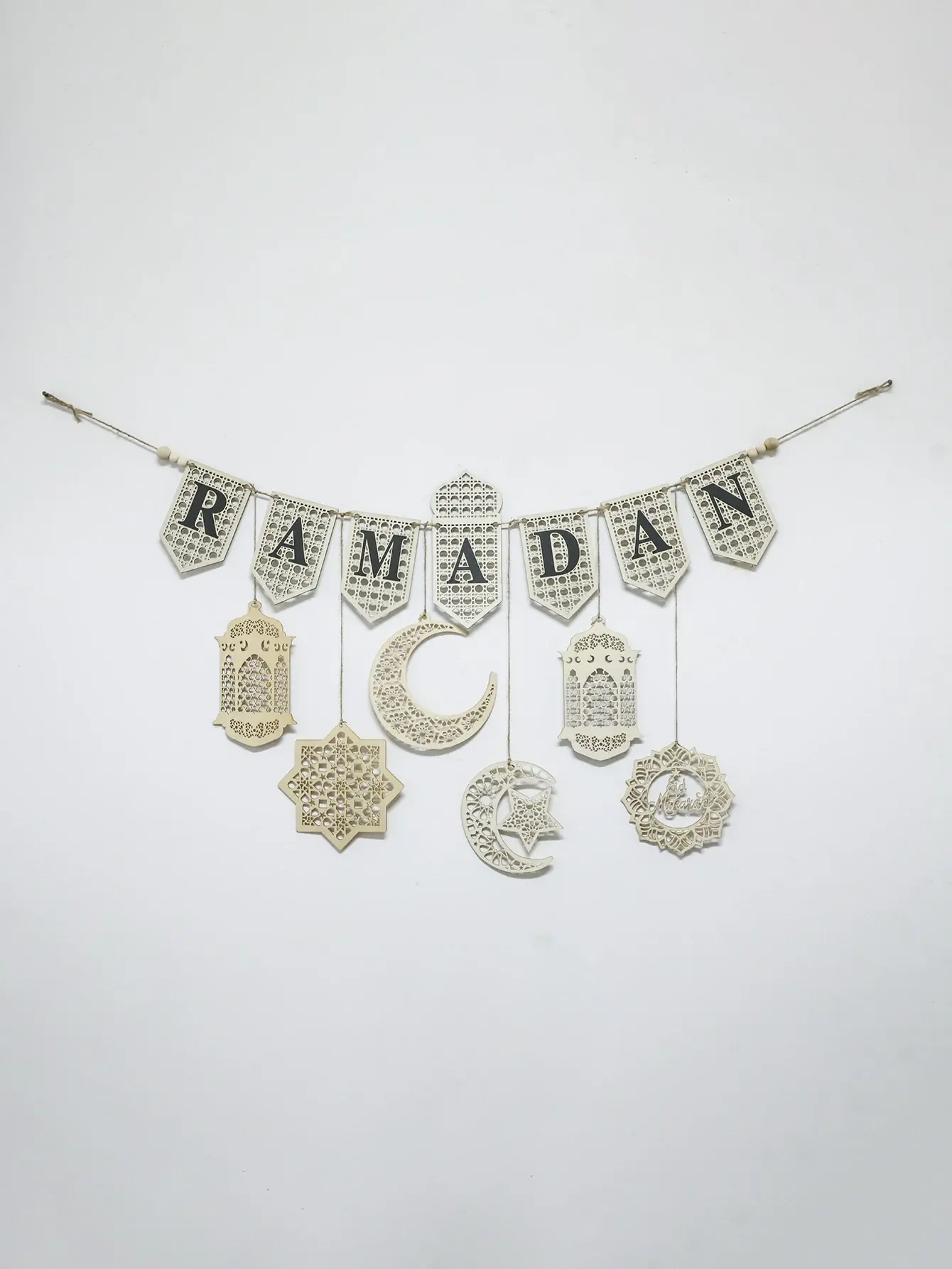 يتميز إكليل لافتة رمضان الخشبية بموضوع إسلامي، مما يجعله ديكورًا مثاليًا للمهرجانات الإسلامية.