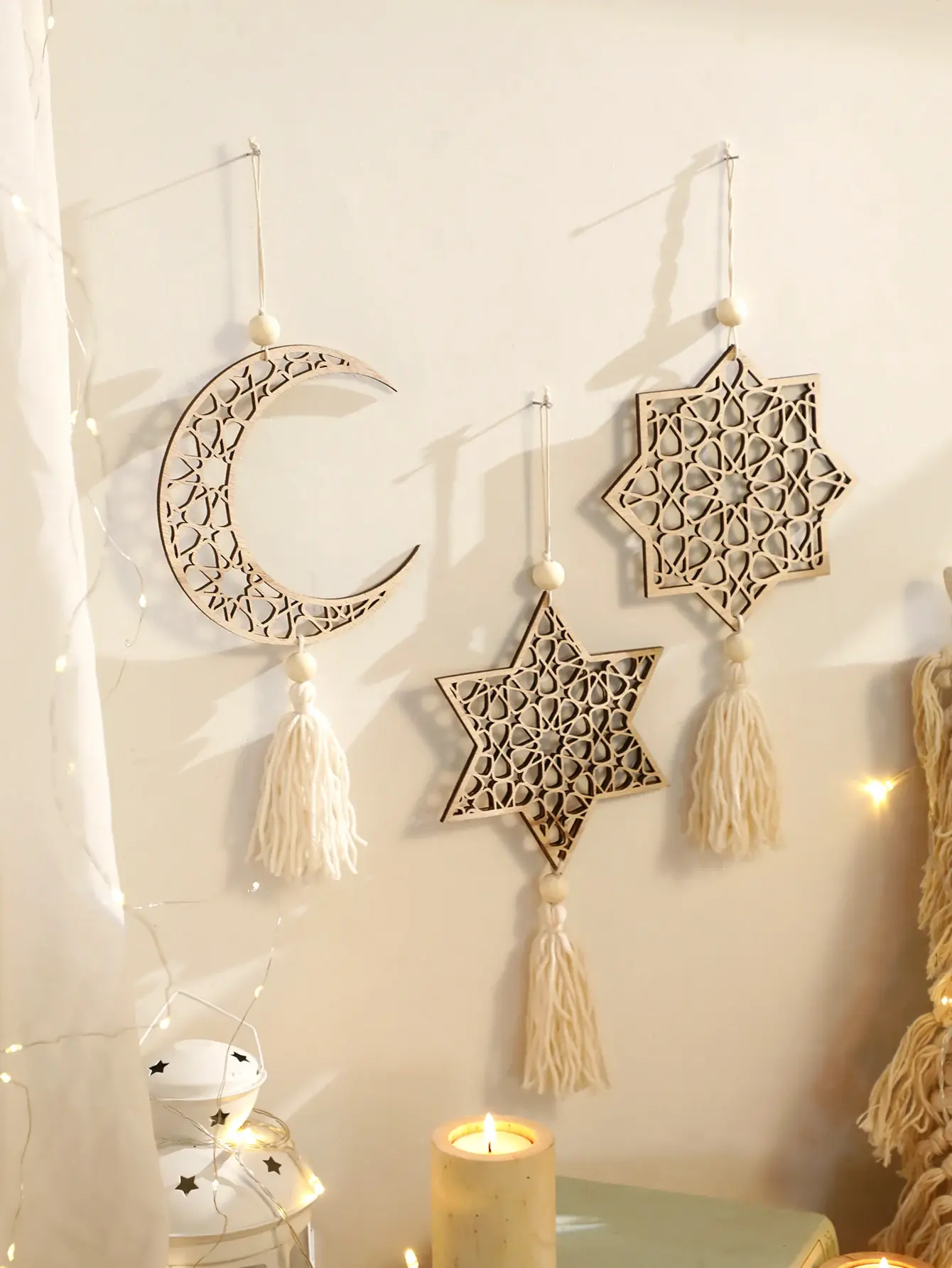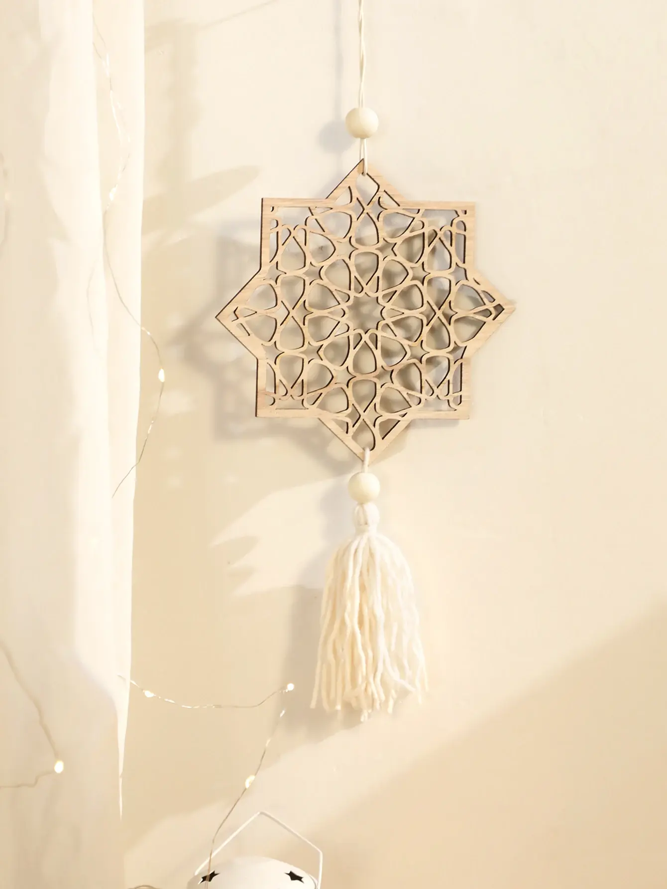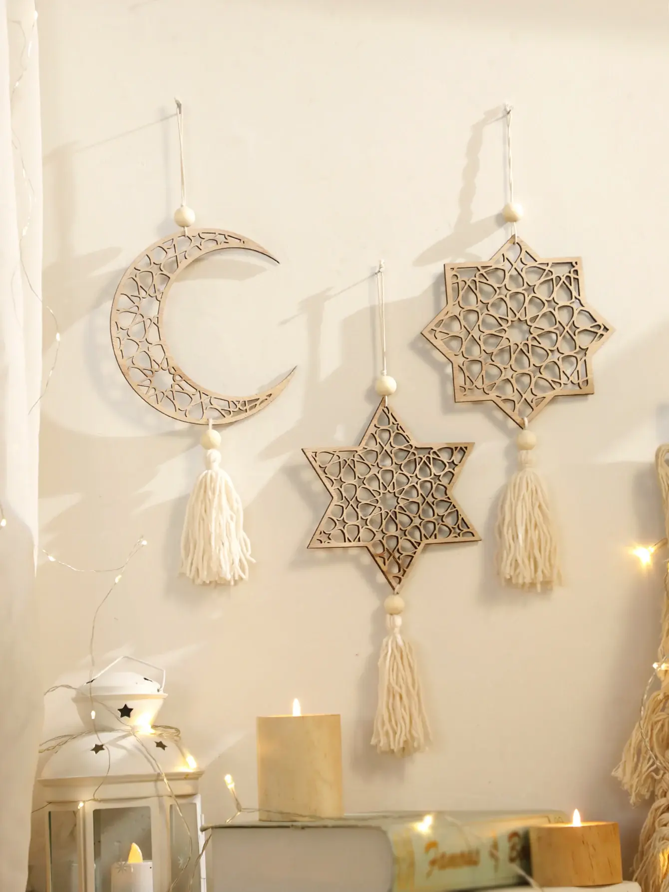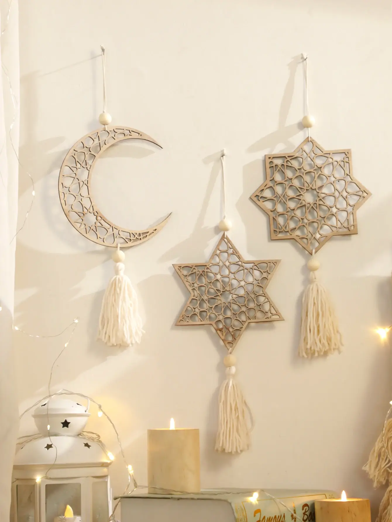 تتميز زخارف رمضان الخشبية المعلقة بتصميم أنيق مع شرابات، مما يضيف لمسة من الرقي إلى أي ديكور مسلم.