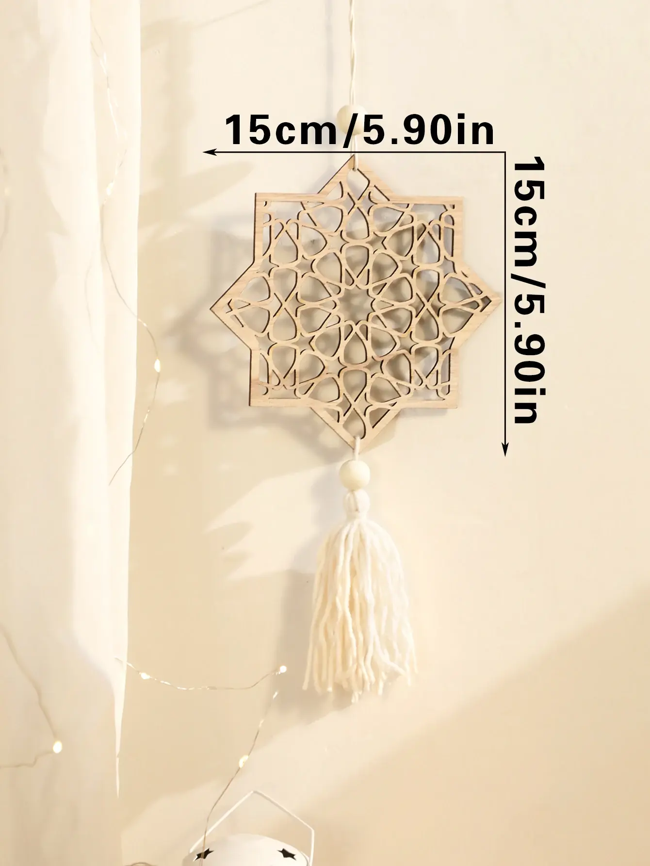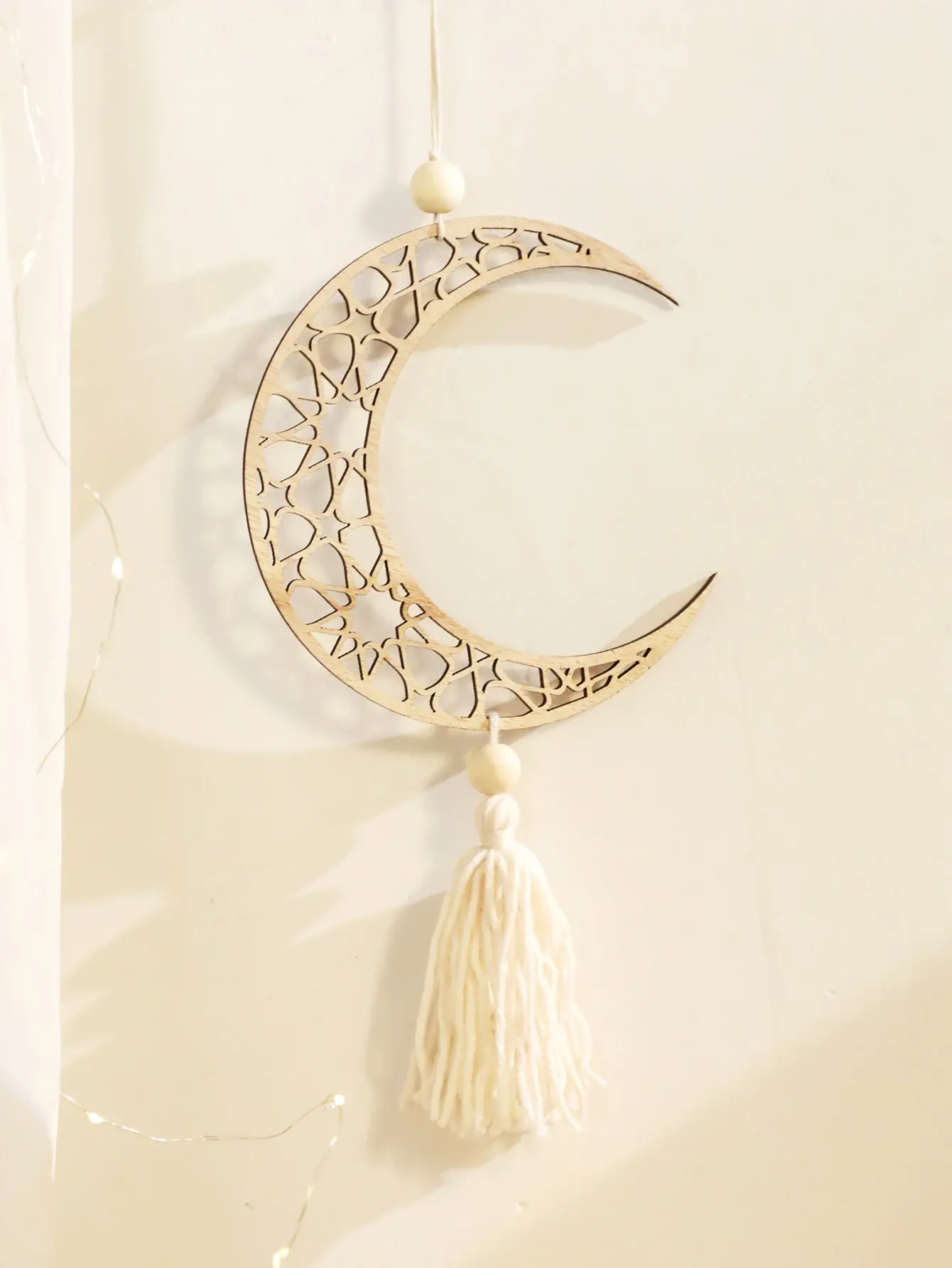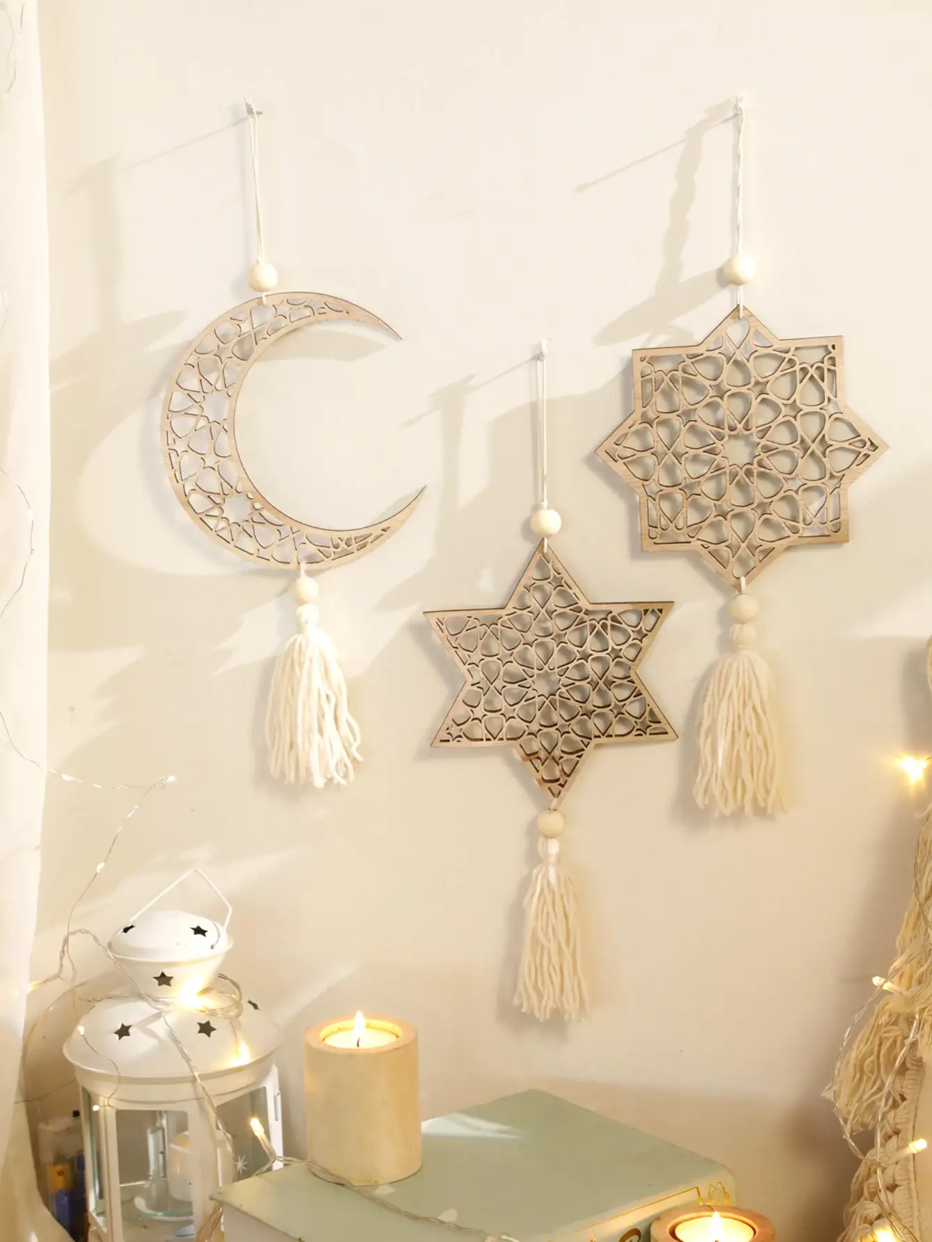 تتميز زخارف رمضان الخشبية المعلقة بتصميم أنيق مع شرابات، مما يضيف لمسة من الرقي إلى أي ديكور مسلم.