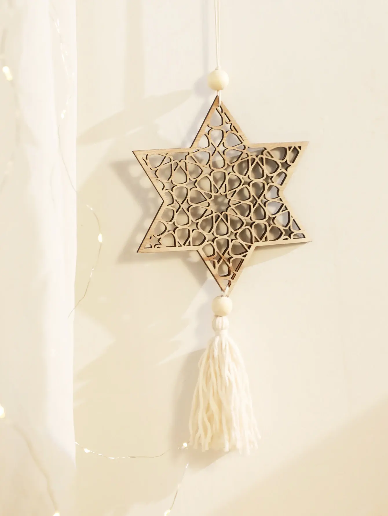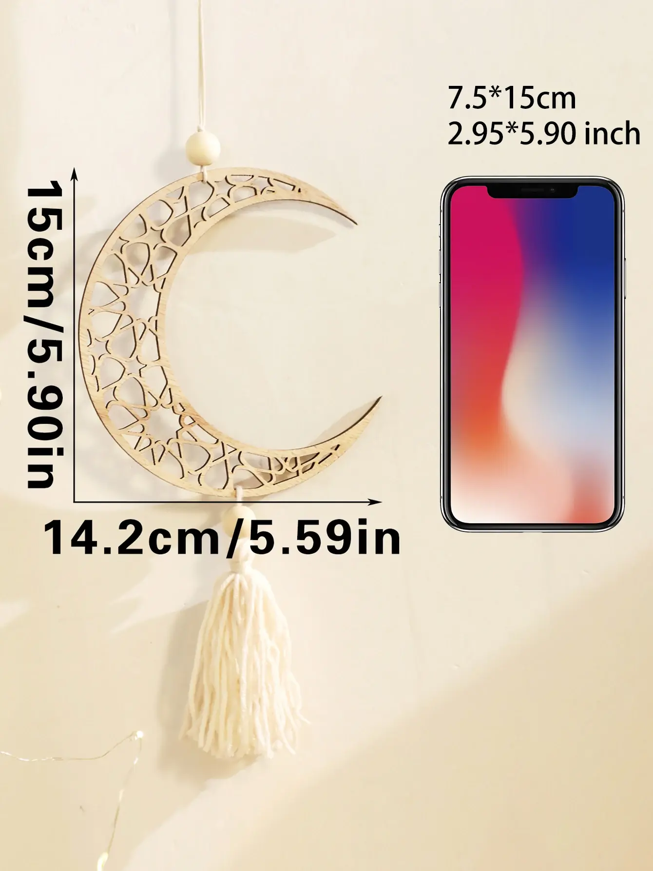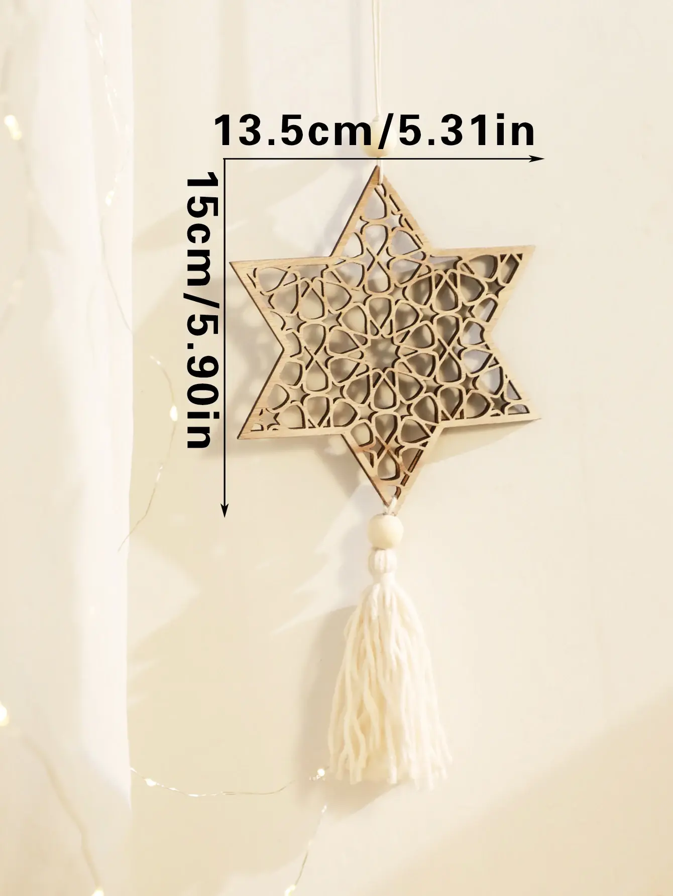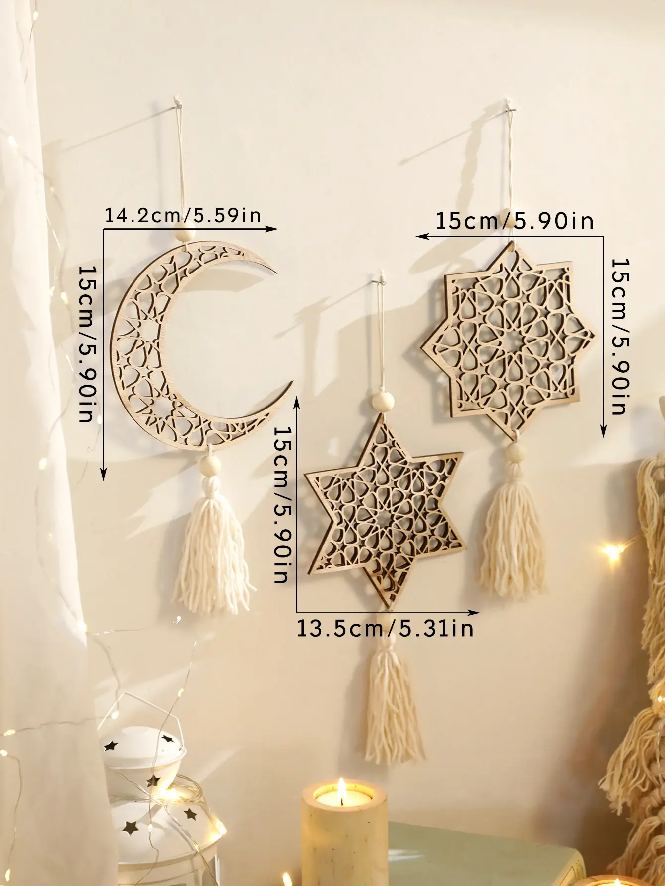 تتميز زخارف رمضان الخشبية المعلقة بتصميم أنيق مع شرابات، مما يضيف لمسة من الرقي إلى أي ديكور مسلم.