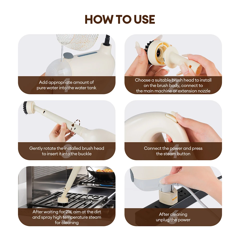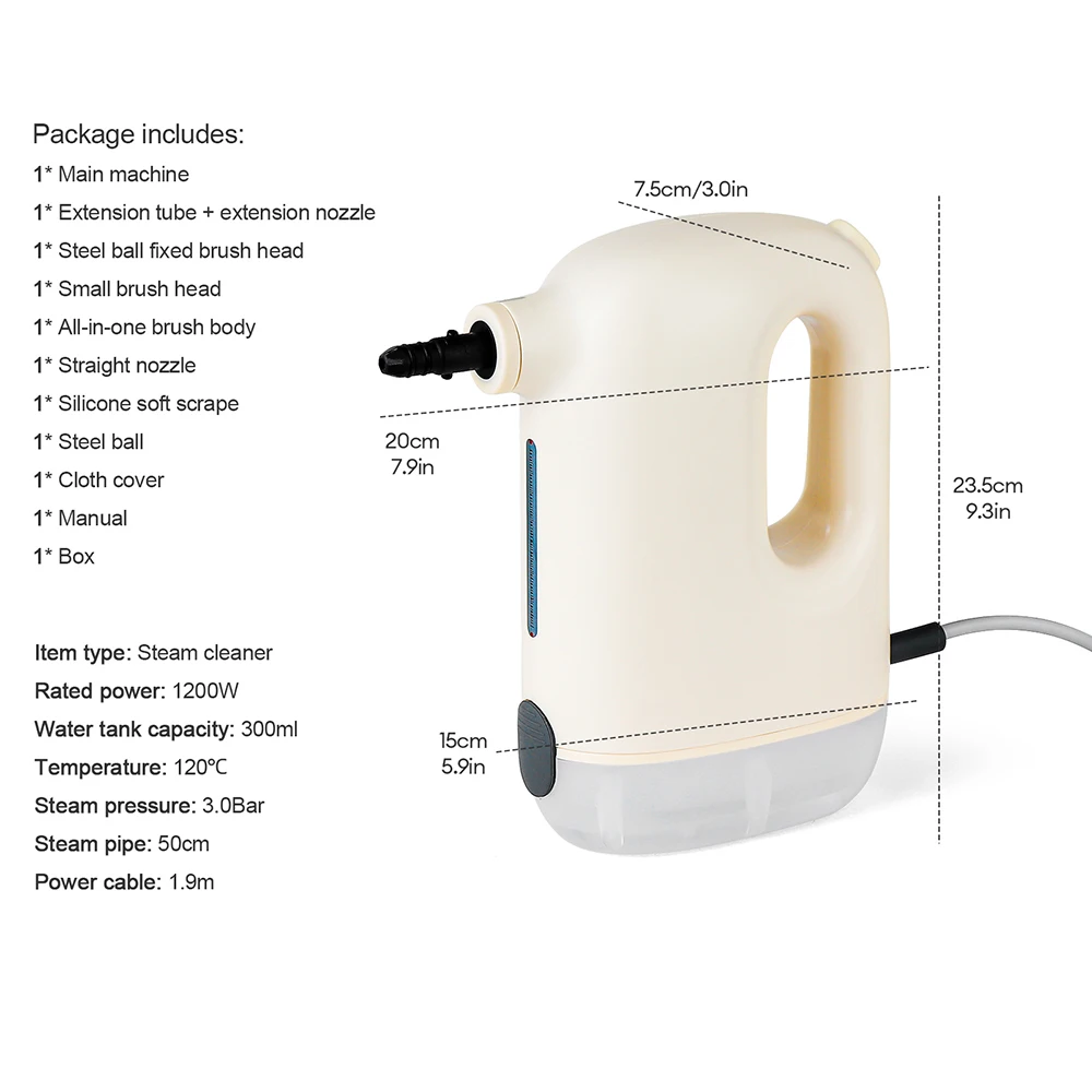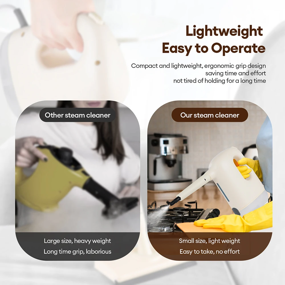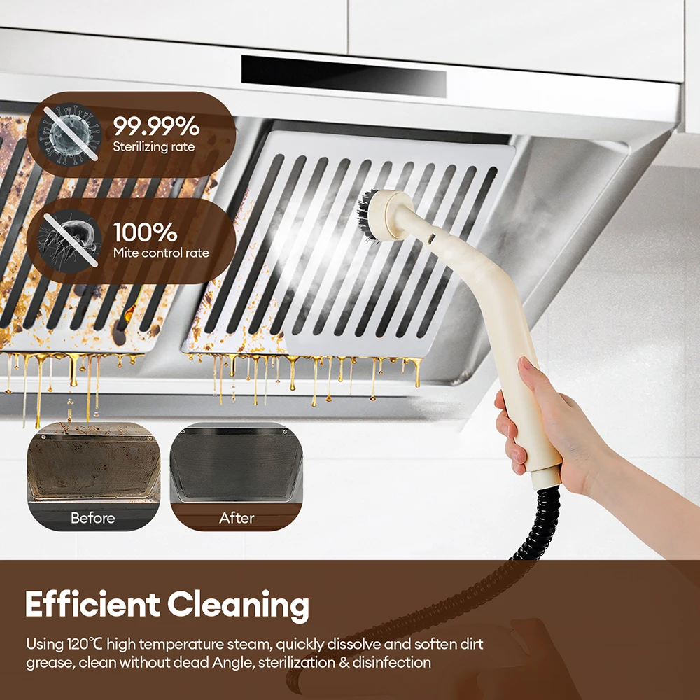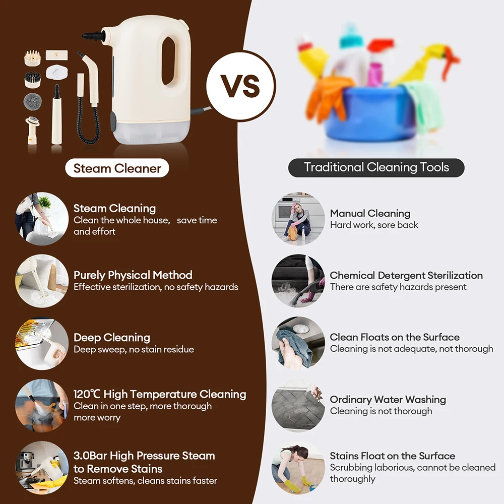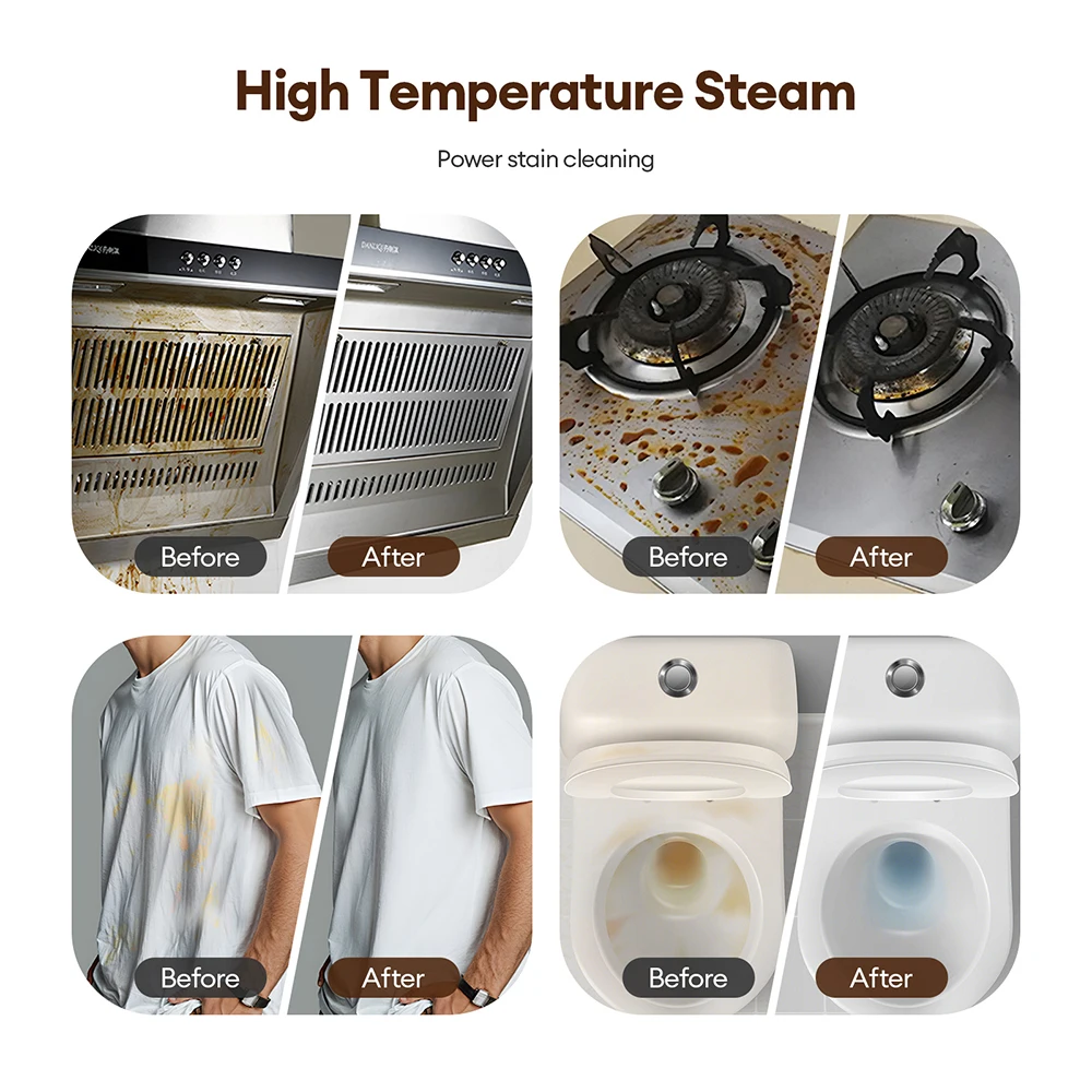 1.Hand-held Steam Cleaner. Heating water into steam releases a high pressure steam of 3.0Bar at temperatures up to 120 ° C, easily removing stubborn dirt, stains and oils, making it a versatile tool for household cleaning.