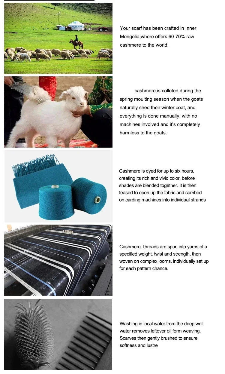 1. We use cashmere of the highest quality from Inner Mongolia , which is about 15.5 micron fine and 36-42 mm long. Cashmere is softer than regular wool ,which eight times warmer than sheep’s wool and 33% lighter.